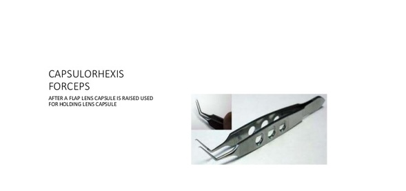 Capsulorhexis Forcep Specification Equipment Type Forceps Material Steel Technology Other Driven Method Manual Weight Light Weight Kilograms (kg) Usage Ophthalmic usage Capsulorhexis Forcep Trade Information FOB Port Delhi India Supply Ability 1 Piece Per Day Delivery Time 2-3 Days Sample Available Yes Main Export Market(s) Australia, South America, Middle East, Africa, Central America, Western Europe, Asia, Eastern Europe, North America Main Domestic Market All India About Capsulorhexis Forcep Capsulorhexis Forceps After a Flap Lens Capsule is Raised Used for Holding Lens Capsule.