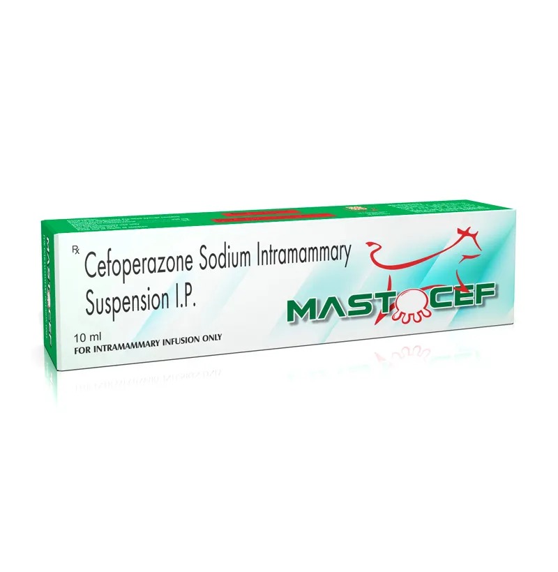 Composition: Each syringe contains: Cefoperazone Sodium IP 1000 mg / 1500 mg / 2000 mg In a sterile intramammary suspension base q.s. Product Overview: Cefoperazone Sodium Intramammary Suspension I.P. is a broad-spectrum third-generation cephalosporin antibiotic formulated for intramammary administration in lactating animals. It is primarily used for the treatment and prevention of mastitis in dairy animals caused by Gram-positive and Gram-negative bacteria. This sterile suspension ensures high local antibiotic concentration in the mammary gland, promoting rapid recovery and restoring udder health, while minimizing systemic exposure. Indications: Treatment of clinical and subclinical mastitis in lactating animals Prevention of post-milking infections Bacterial infections of the mammary gland caused by Staphylococcus, Streptococcus, E. coli, and other susceptible organisms Mechanism of Action: Cefoperazone inhibits bacterial cell wall synthesis by binding to penicillin-binding proteins (PBPs), leading to bacterial cell lysis and death. Its broad-spectrum activity makes it effective against both Gram-positive and Gram-negative pathogens. Dosage & Administration: Administer as an intramammary infusion directly into the affected quarter(s) of the udder. Follow veterinary guidance for dosage, frequency, and duration based on the severity of infection. For veterinary use only. Key Benefits: Broad-spectrum cephalosporin effective against mastitis pathogens Rapid resolution of udder infections High local concentration ensures effective bacterial clearance Reduces inflammation and promotes udder health Sterile, ready-to-use intramammary suspension Packaging: Available in 10 mL / 15 mL / 20 mL sterile syringes. Storage: Store below 25°C, protected from light. Do not freeze. Keep out of reach of children and animals.